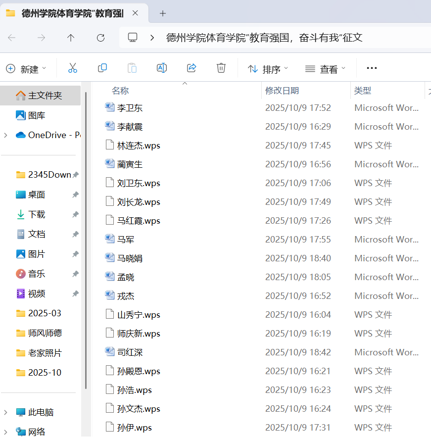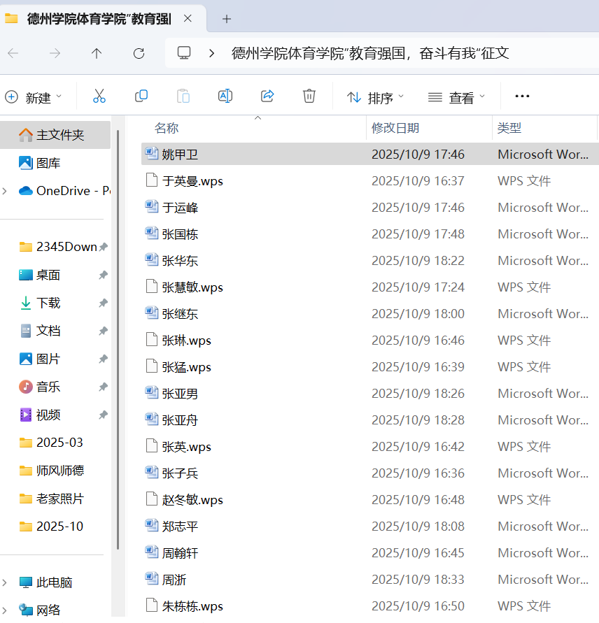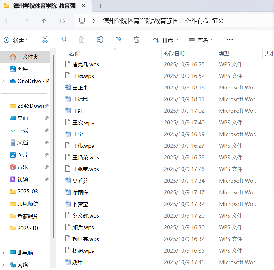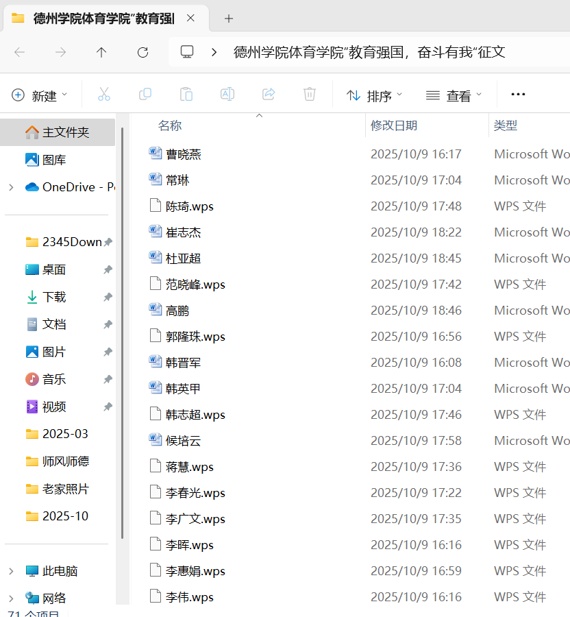 为庆祝2025年国庆节,深化师风师德建设月精神文明建设成果,体育学院工会于10月1日至8日组织开展“教育强国,奋斗有我”国庆主题征文活动,学院全体71名教职工参与其中。