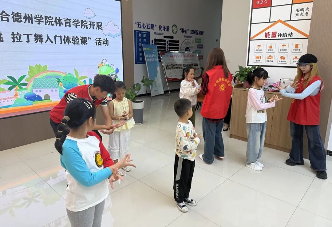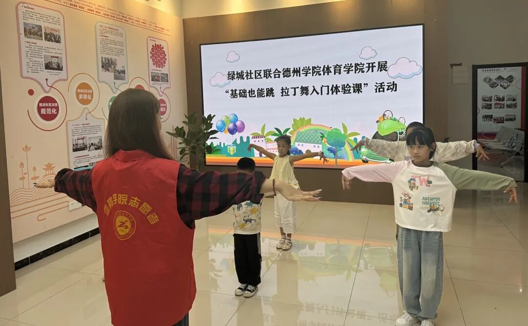 为打破艺术学习的⻔槛、丰富社区少⼉课余⽣活、提升孩⼦们的身体素质与艺术素养, 志愿者们以志愿服务为纽带,搭建⾼校与社区联动的育⼈平台。9⽉ 27⽇下午,德州市绿 城社区活动室⾥传来孩⼦们的欢笑声,德州学院体育学院的志愿者们正带领⼩朋友们开展 “零基础也能学拉丁”公益教学活动,⽤专业与耐⼼为孩⼦们打开舞蹈艺术的⼤⻔。