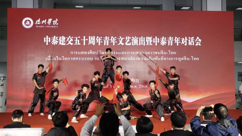 为庆祝中泰建交50 周年,深化中泰文化互鉴、筑牢青年友谊纽带,我校于11月3日举办“庆祝中泰建交五十周年文艺演出暨中泰青年对话会”。体育学院师生受邀参演,以武术节目《拳倾四海谊结千秋》献礼,现场中外嘉宾及留学生群体掌声雷动,喝彩声此起彼伏。