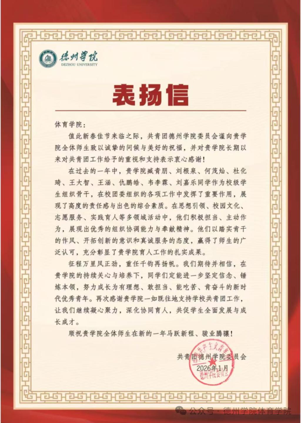 近日,共青团德州学院委员会向我院发来表扬信,对我院臧青朋、刘根泉、何茂灿、杜化琦、王大智、王涵、仇鹏皓、韦李霖、刘嘉乐等九名同学提出表扬,充分肯定了他们作为校级学生组织骨干,在过去一年中为学校共青团工作作出的积极贡献。