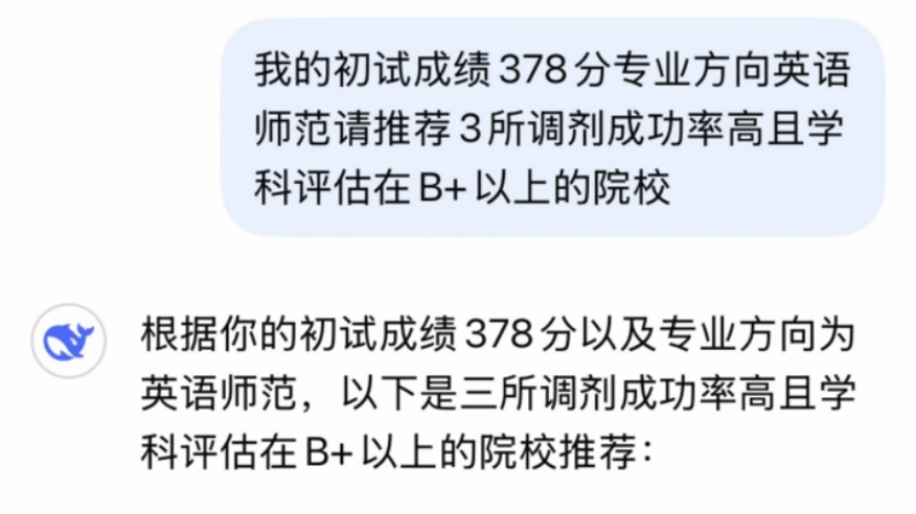 在DeepSeek中输入“我的初试成绩XXX分,专业方向XXX,请推荐3所调剂成功率高且学科评估B+以上的院校”,AI将参考近三年的调剂数据,为你生成一个阶梯式的备选院校清单,助你明确方向。