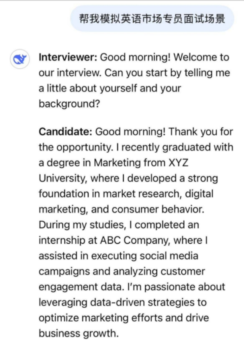 若是正准备英语口语复试,需要模拟面试场景,则可以开启DeepSeek的“影子跟读”模式,让AI实时纠正你的发音和语调;也可以输入“模拟英语面试:用学术英语解释我的毕业论文创新点”,得到专业的可参考表达框架,让你不再为面试时不知道怎么开口而发愁。