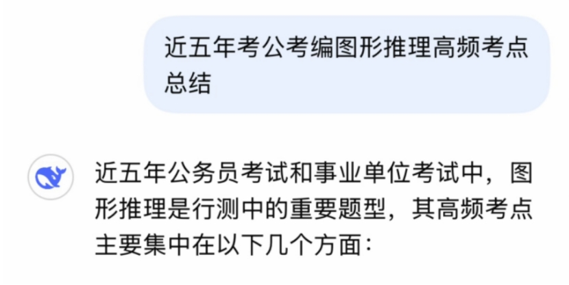 考公的小伙伴们想提高行测成绩,只要在DeepSeek里输入“近5年图形推理高频考点总结”,马上就能得到带有解题公式的思维导图,助你快速掌握考点。此外,开启“限时刷题模式”,例如:资料分析25分钟做20题,便能训练提升你的做题速度。