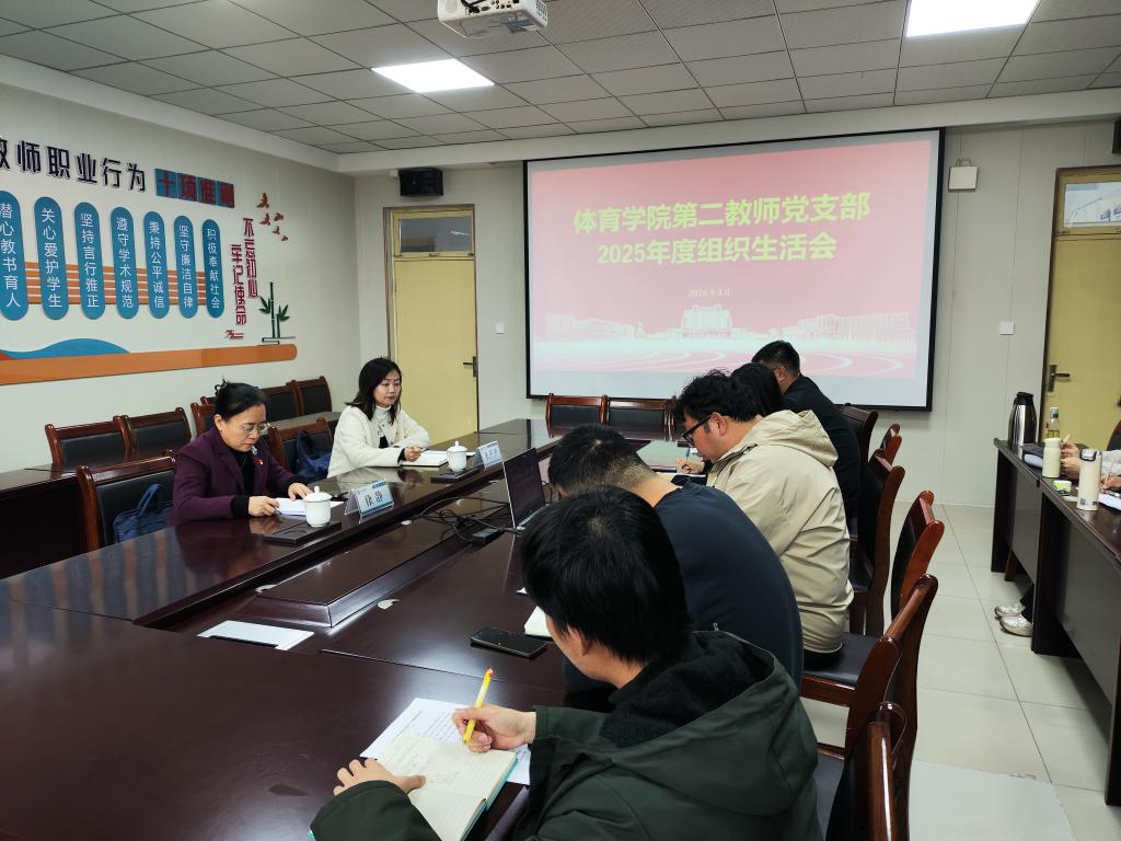 3月25日,学校党委委员、副院长徐静列席体育学院第二教师党支部2025年度组织生活会,并作点评讲话。校党委组织部张严严列席会议。