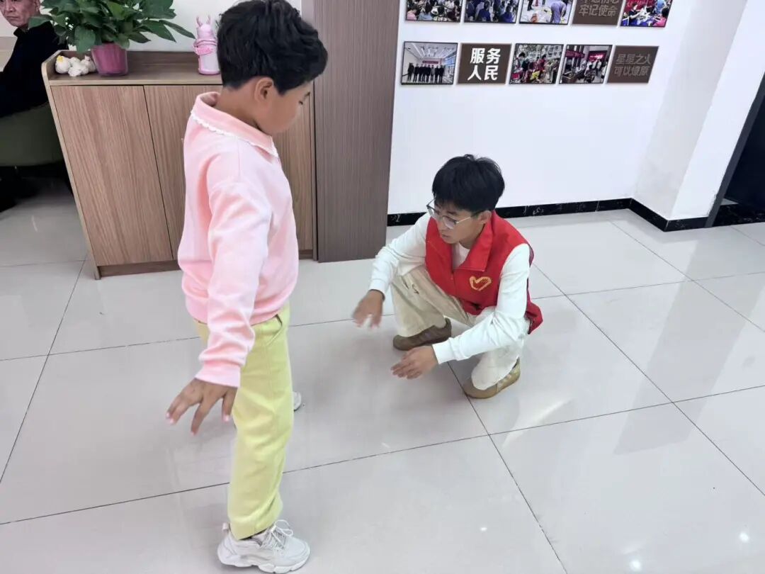 针对部分同学跟不上节奏、动作不标准的问题,活动创新性采用“一对二”指导模式。志愿者们根据小朋友们的学习进度与接受能力,两人一组结对帮扶:手把手调整小朋友们的肢体姿态、耐心讲解动作发力要点,让小朋友们直观认识到自己的动作问题,以便于动作的改正。