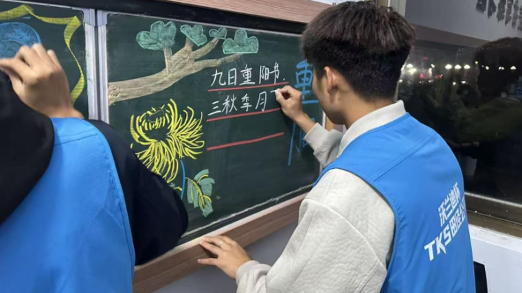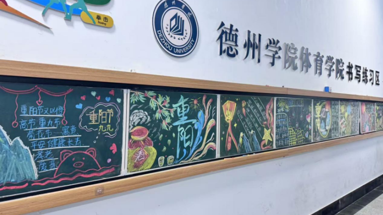 2025年10月26日 德州学院为庆祝九九重阳节到来,特地举办“情暖金秋,爱在重阳”主题活动。同学们纷纷拿起画笔,以黑板为画板,描绘出最美丽的重阳景色,写出最真挚的祝福。