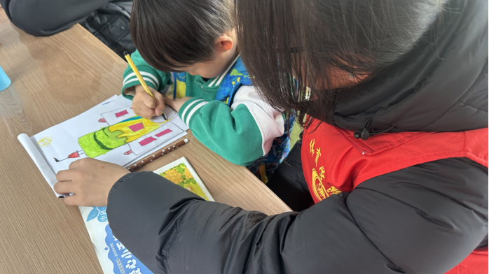有内向的孩子不敢开口,志愿者便蹲下身,与他平视,轻声安抚道“没关系,慢慢说”,手把手教他指着文字跟读,一句一句耐心引导;遇到活泼好动的孩子,志愿者便顺着他的兴趣,结合绘本内容玩起“故事接龙”小游戏,让他在玩乐中沉浸到文字世界里。除了读书教学,志愿者们还带着孩子们做简易手工,彩纸、剪刀、胶水在小手中翻飞,志愿者们手把手教孩子们折千纸鹤、剪窗花,陪着他们发挥想象创作专属作品,活动室里的朗朗书声、阵阵笑声与细碎的交谈声交织在一起,格外动人。