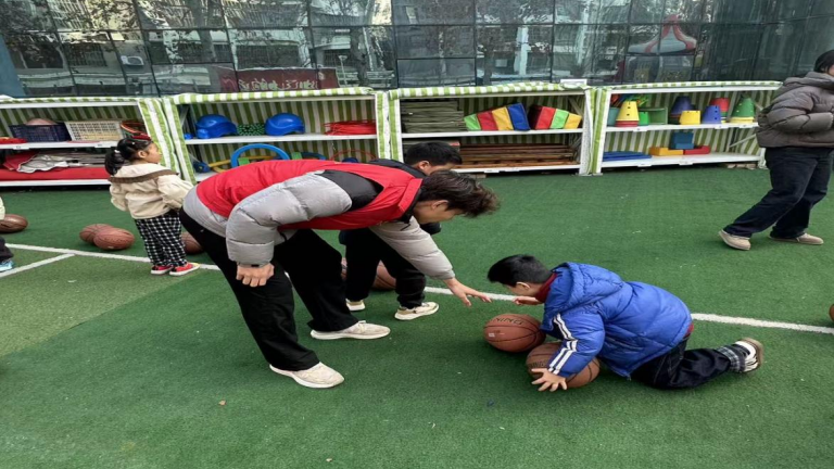 12月17日下午,冬日的阳光暖暖地洒在幼儿园的操场上,体育学院的志愿者们带着活力与热忱,开启了一场特别的篮球教学之旅。