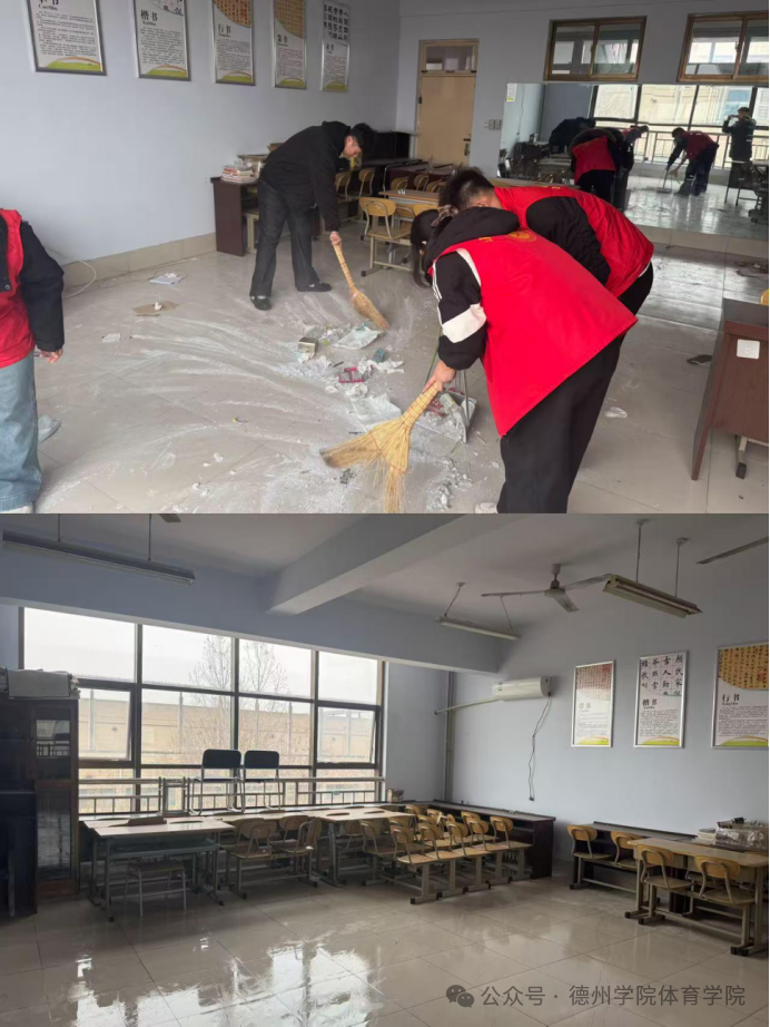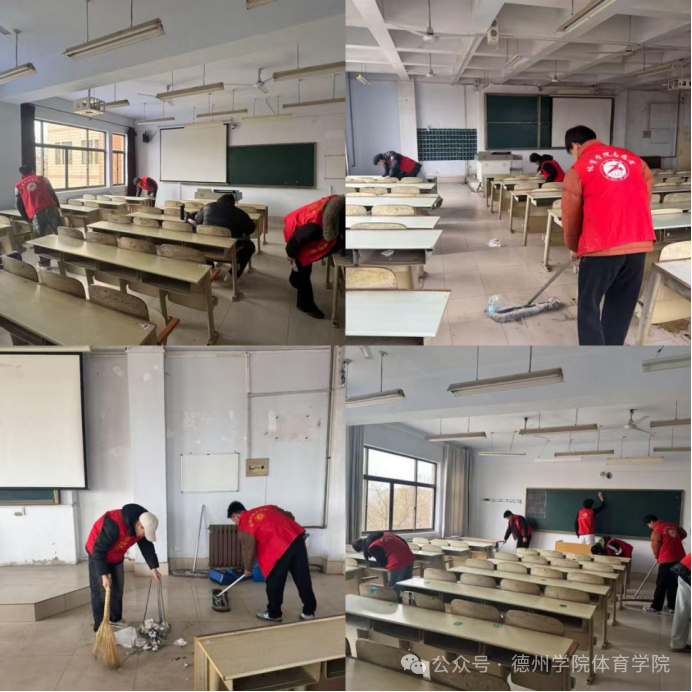 为弘扬雷锋精神,营造整洁优美的校园环境,在新学期开学之际,德州学院体育学院于3月8日晚组织学生志愿者,对体育楼、体育场馆及教室开展全面卫生清扫工作,以实际行动践行志愿服务理念,为师生打造干净舒适的学习训练空间。